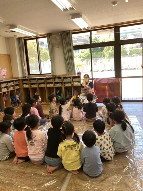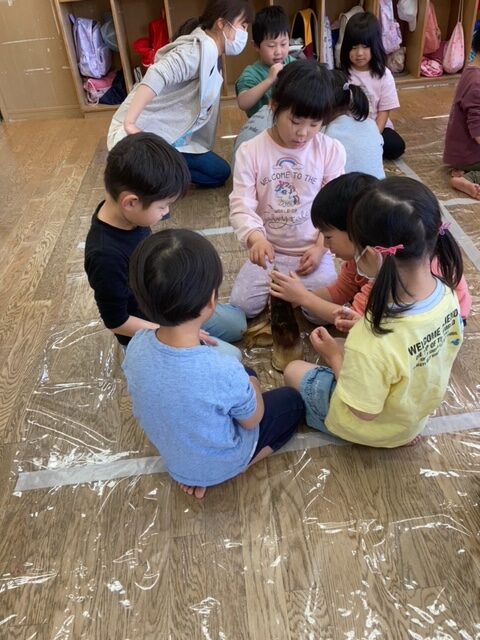 4月25日(火)、5歳児はくちょう組さんが、筍の皮むきをしました😊